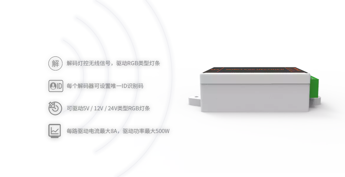 This product is a wireless decoding constant voltage LED driver used with LNX-310W. The decoder receives and decodes the wireless signal from LNX-310W, and then drives various constant voltage types of LED strips and panels: