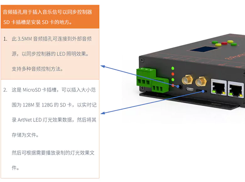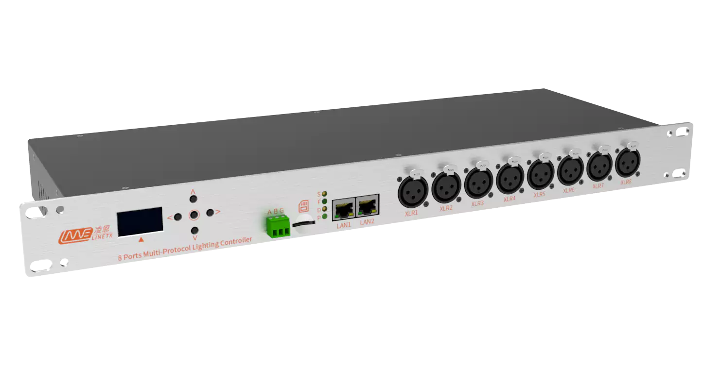 ü 8个DMX灯具接口,每个通道一个域,总计8个域4096个通道,驱动如摇头灯、射灯、点光源等DMX灯具 ü 支持RDM功能,支持RDM Over ArtNet功能 ü 全磁隔离型DMX512接口,有效的增强了设备的稳定性和安全性 ü 支持ArtNet/sCAN协议,及相关软件(Freestyer、MA2控台、Madmapper等) ü 可录制ArtNet数据,支持最大256G 的SD卡录播 ü 支持DMX512转ArtNet,将DMX512转化为网络ArtNet数据发送出去 ü 可多机网络同步播放驱动灯带的同时驱动其他分控、也可作为分控接收主控信号 ü 多机网络同步播放,多个设备通过网络进行SD的同步播放,实现大规模的控制 ü 支持KNXnet/IP协议,支持通过ETS5对其进行配置 ü 支持UDP远程命令功能,通过远程ASCII文本命令控制设备 ü 支持云控功能,通过凌恩云平台,使用手机随时随地控制设备(需提供设备号) ü 带3.5mm的LINEIN音频接口,实现音频节奏与灯光的同步 ü 自带时钟日历,支持时控,可按照需要建立多个播放计划 ü 支持固件升级功能,可在凌恩的LnxManager管理平台通过网络升级设备固件 ü 双网口,内置交换机,可一进一出,使用网线连接各设备 ü 设备工程锁,按照工程需要锁定设备,到时间后需提供解锁密码才能继续使用 ü 中英文双语WEB管理系统,轻松管理和配置设备的各项功能 ü OLED屏 + 5键导航配置功能,可就地操作和配置设备 ü 免费提供凌恩的LnxEffect灯控软件,一体化制作灯效和管理凌恩设备 |
