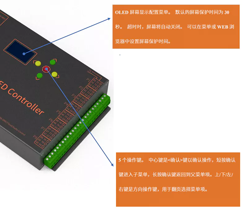 ü 支持外控功能,使用外部DMX控台输出的DMX512信号,快速切换设备的SD卡文件的播放,调整播放速度,调整亮度等参数 |